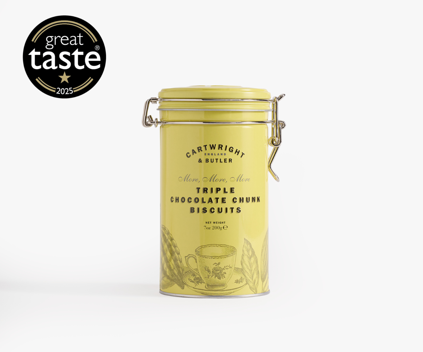 A classic chocolate chip cookie, recipe taken to a whole new level. The chocolate chips are a trio of chocolate chunks: white chocolate, milk chocolate and plain chocolate. A chocoholic's dream biscuit. Presented here in one of our special biscuit tins, with a clip-top style resealable lid.