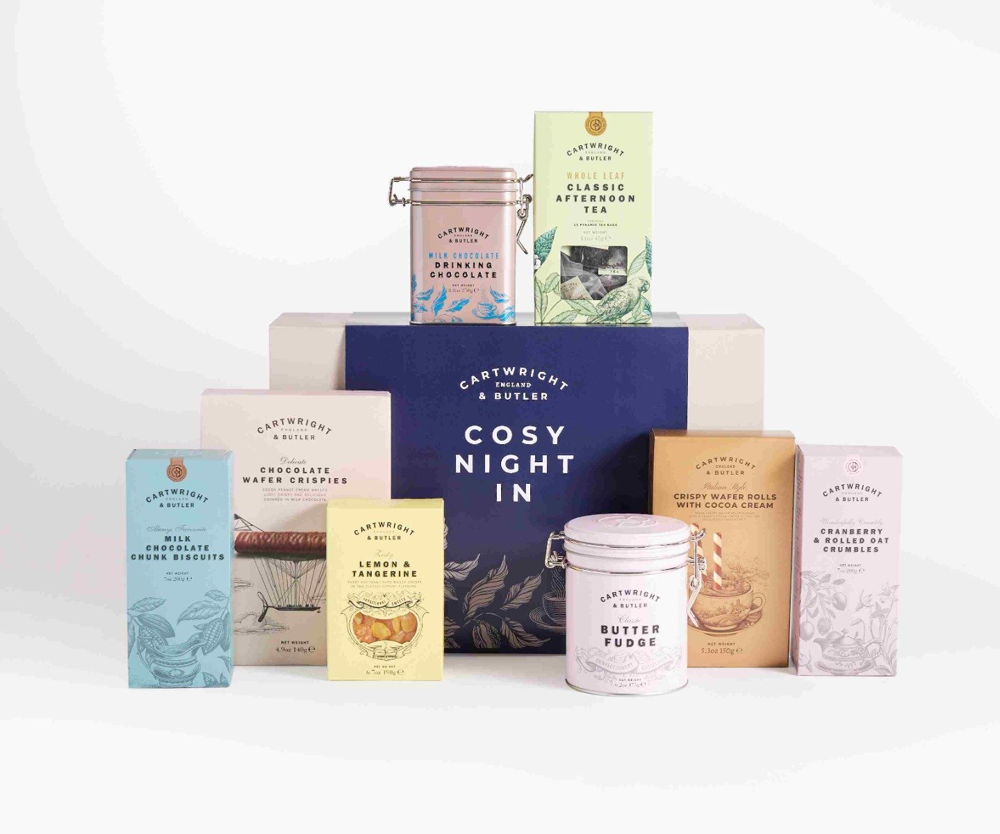 Grab the blankets, light the fire, pop your favourite film on the TV and snuggle up with Cartwright & Butler's Cosy Night in Treat Box. Containing all the essentials for a relaxed, indulgent evening, the Cosy Night in Treat Box contains a wide variety of treats for the full family to enjoy. The gift set features delicious hot drinks including our Classic Afternoon Tea Blend, and the brand new Milk Chocolate Drinking Chocolate, smooth flakes of milk chocolate, irresistible when stirred into warm milk. The set offers a variety of biscuits and sweet treats, including Milk Chocolate Chunk Biscuits, Chocolate Wafer Crispies, Chocolate Wafer Rounds, Butter Fudge, Cranberry Crumbles and Lemon & Tangerine Slice Sweets.