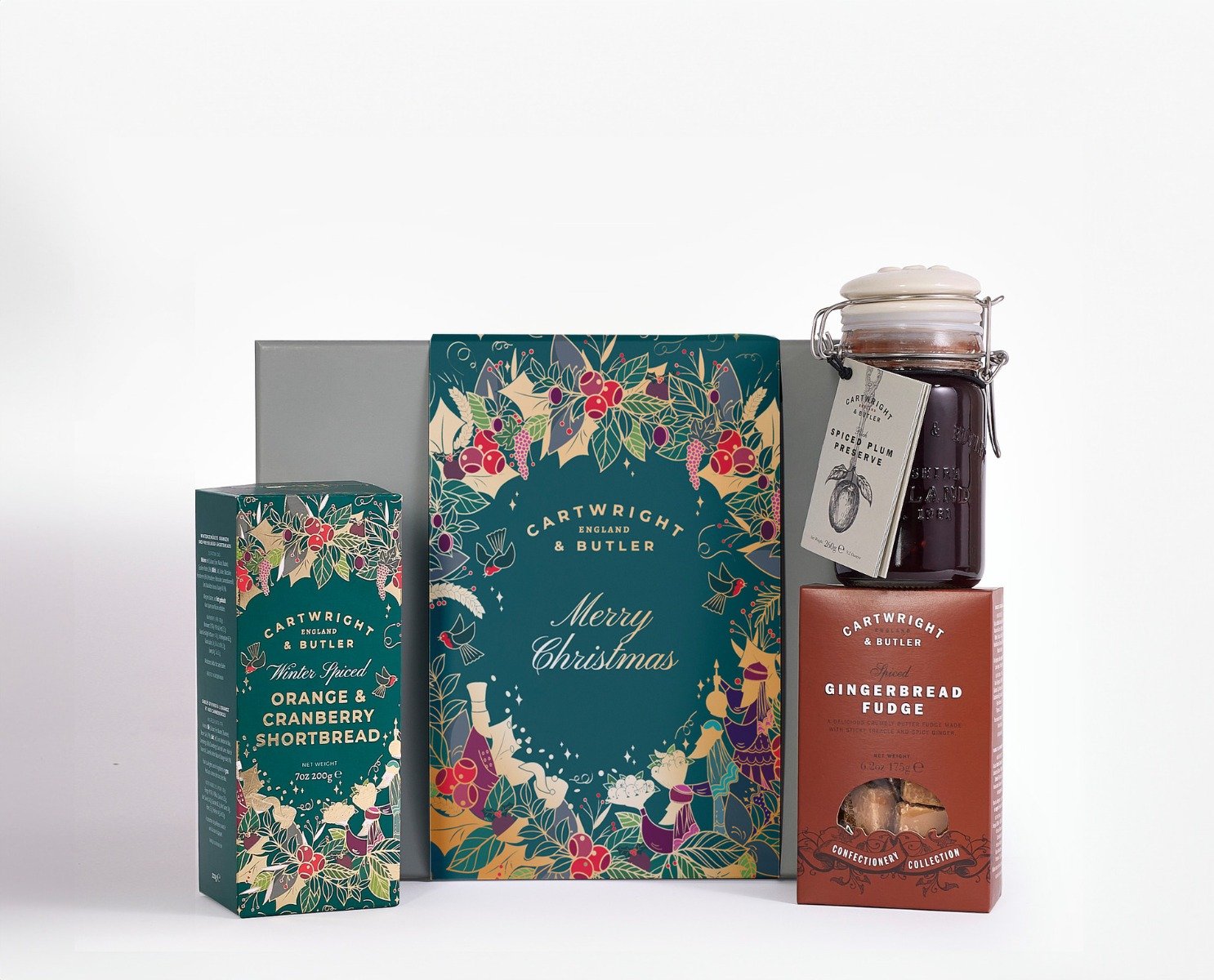 Our Festive Treats include Winter Spiced Orange & Cranberry Shortbread Rounds, Spiced Plum Preserve and our Gingerbread Fudge. All beautifully packaged in a festively decorated box.