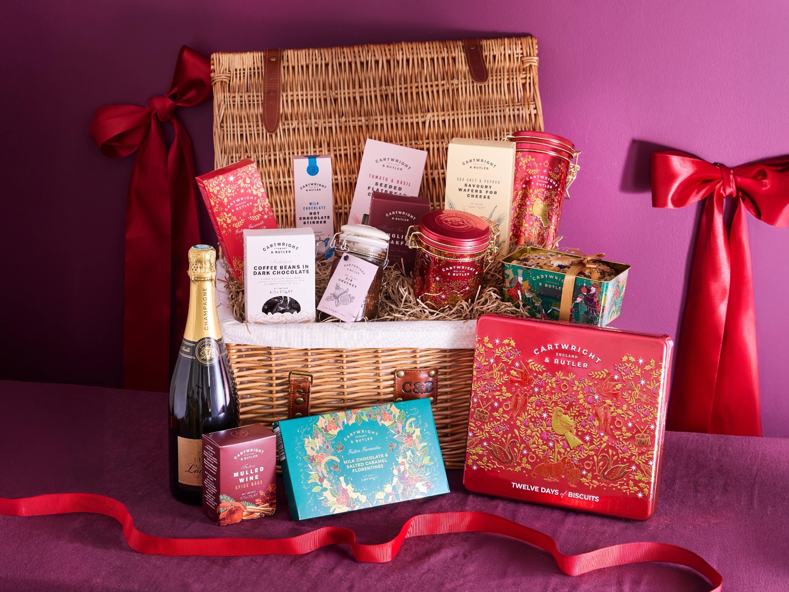 Celebrate the season with this all-new festive hamper for 2025, crafted to make this Christmas truly special. This generously filled wicker basket is brimming with a luxurious array of sweet and savoury delights, from crumbly Spiced Orange & Cranberry Shortbreads to rich, creamy, Butter Fudge, encased in a 12 Days of Christmas tin that brings the beloved carol to life. And to toast the festivities, a bottle of Louis Veille Champagne. This hamper is the ultimate gift for those who believe Christmas should be nothing short of indulgent.