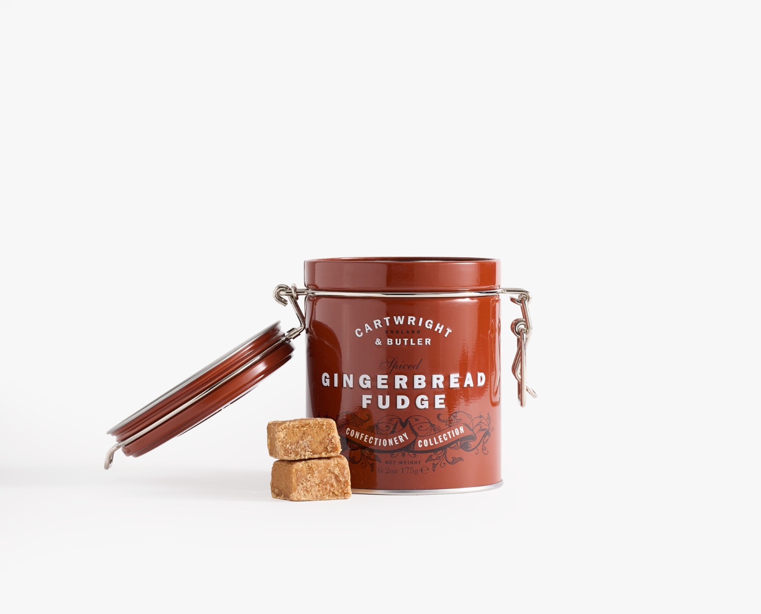 Our rich and creamy Gingerbread Fudge Tin makes for the perfect sweet treat. Made from a traditional all-butter recipe originating in Scotland, our Gingerbread Fudge has a delicious mixture of spicy ginger with hints of sticky treacle. Our Gingerbread Fudge is secured inside one of our beautifully-designed Cartwright & Butler clip-top jars offering a wide range of reusability, such as storing tea bags and biscuits.