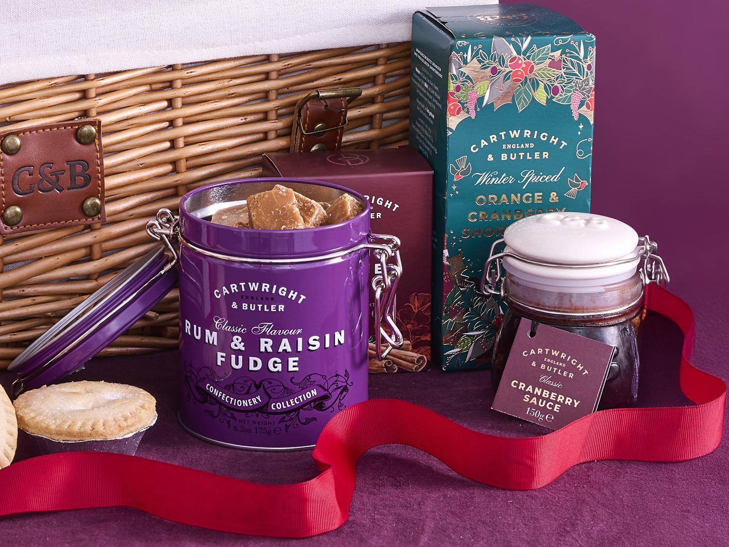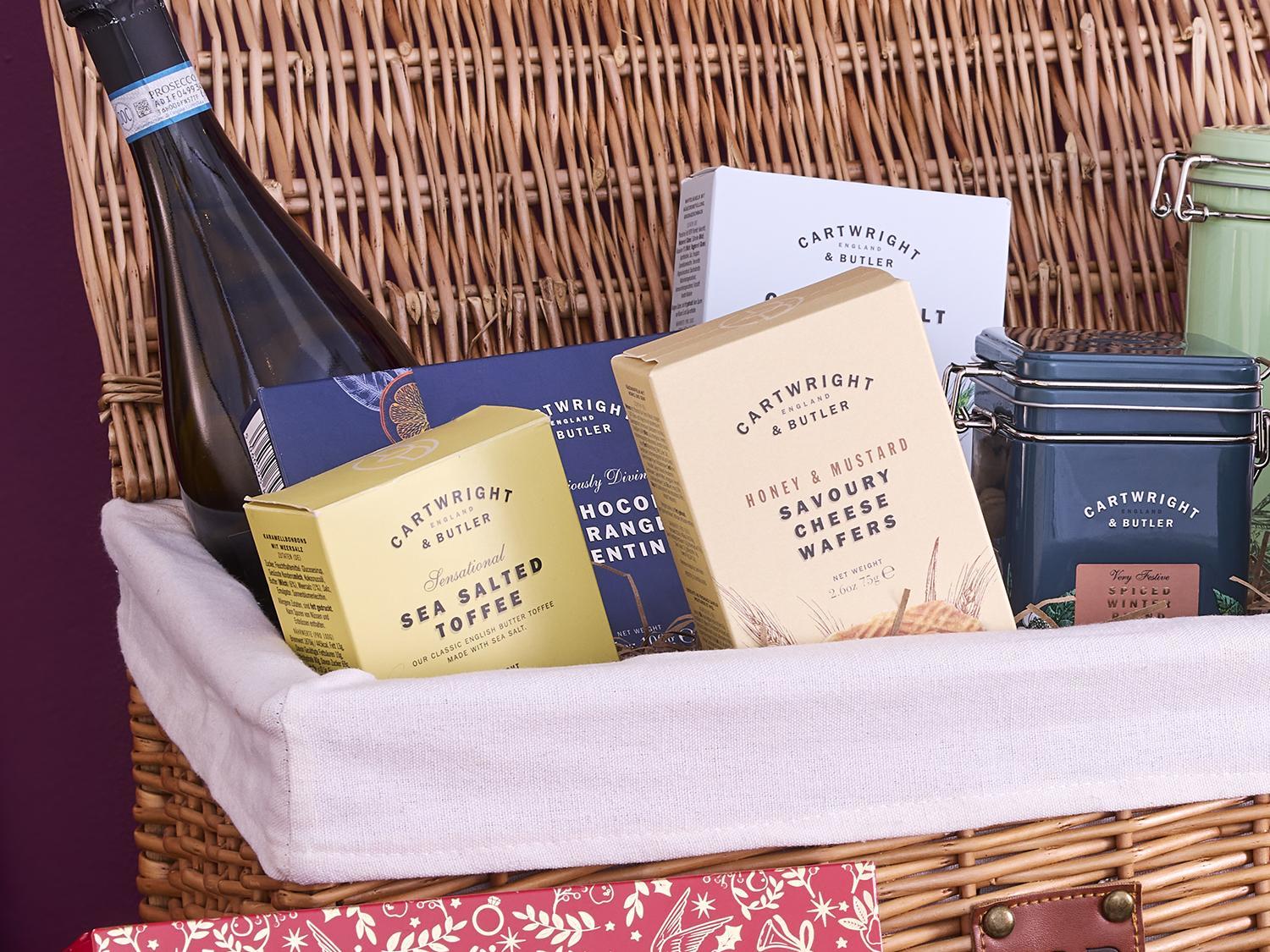 The Luxury Festive hamper contains an array of festive treats such as luxury mince pies, florentines, rich cakes, fudge and savoury delights. All presented neatly in a natural wicker basket.