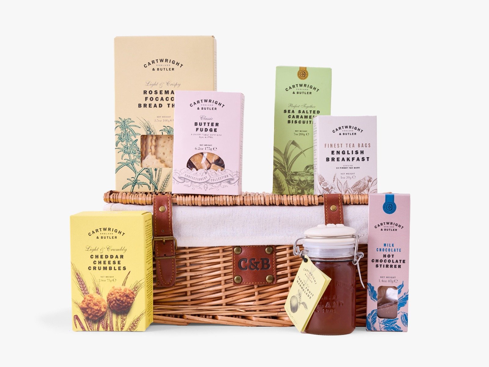 The Ripon Hamper is a traditional wicker basket hamper with a selection of Cartwright & Butler's finest preserves, delicious sweet treats and savoury snacks.