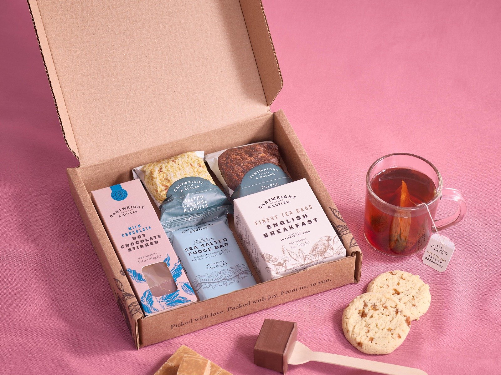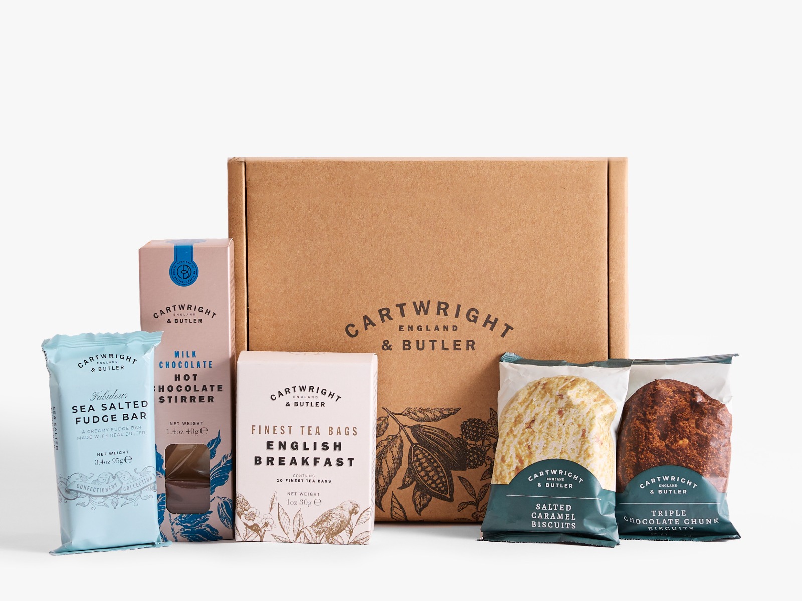 The Tasty Treats Box is the ultimate little box of joy… embrace a little taste of everything sweet! From Triple chocolate chunk biscuits, to a luxury hot chocolate stirrer and traditional English breakfast tea. Presented neatly in this slim recyclable illustrated box.